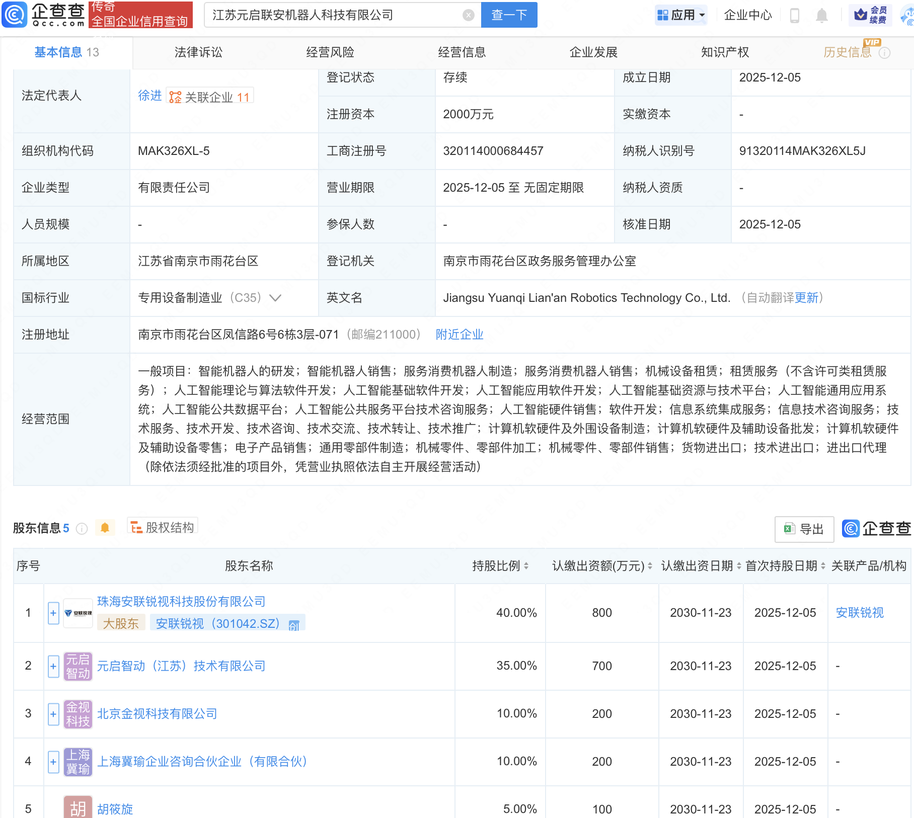 近日,江苏元启联安机器人科技有限公司成立杭州期货配资公司,注册资本2000万元,经营范围包含:智能机器人的研发;智能机器人销售;人工智能基础软件开发;人工智能应用软件开发;人工智能基础资源与技术平台等。企查查股权穿透显示,该公司由安联锐视(301042)等共同持股。