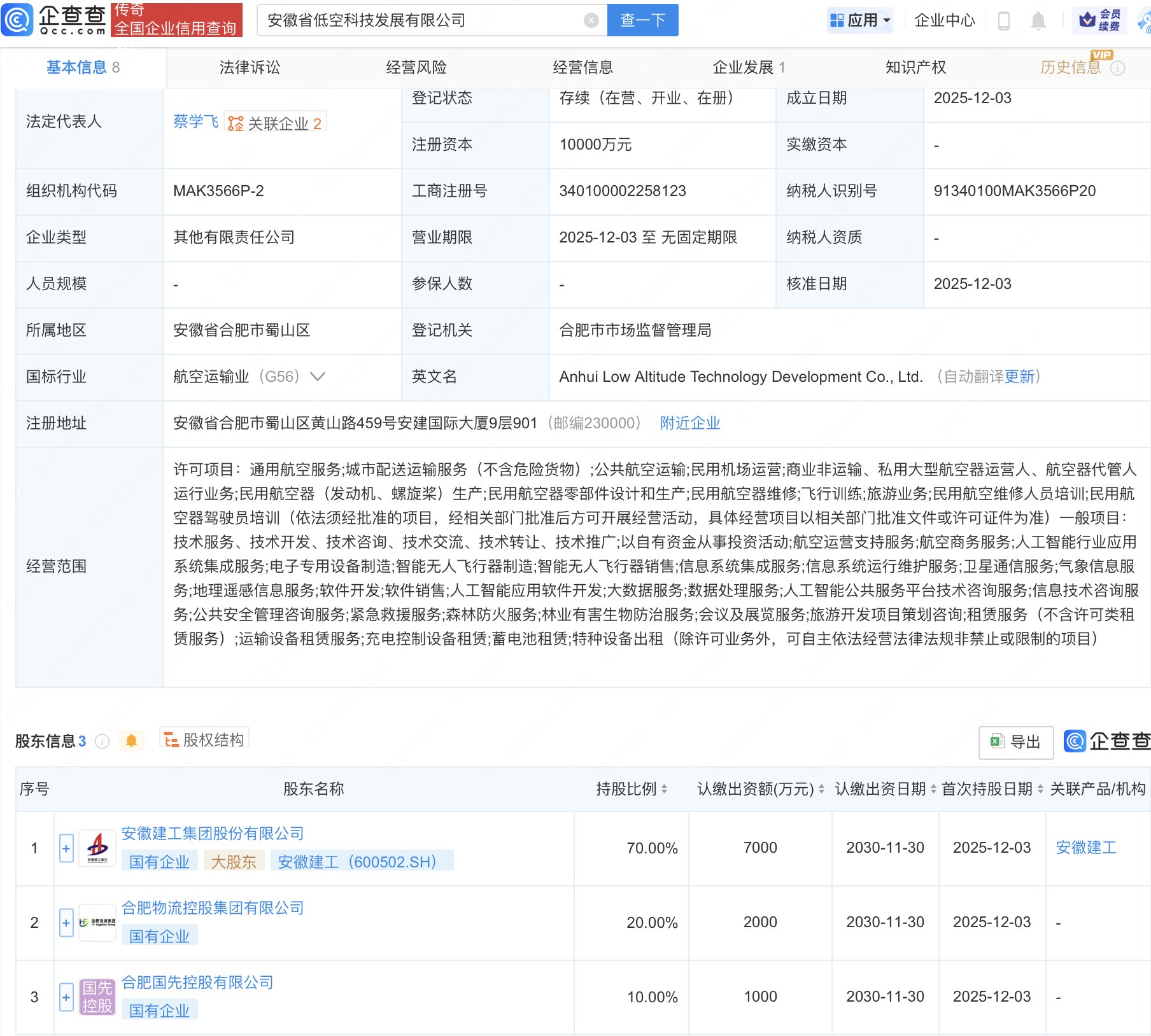 近日股票配资合同范本,安徽省低空科技发展有限公司成立,注册资本1亿元,经营范围包含:民用航空器零部件设计和生产;智能无人飞行器制造;人工智能应用软件开发;人工智能公共服务平台技术咨询服务等。企查查股权穿透显示,该公司由安徽建工(600502)等共同持股。